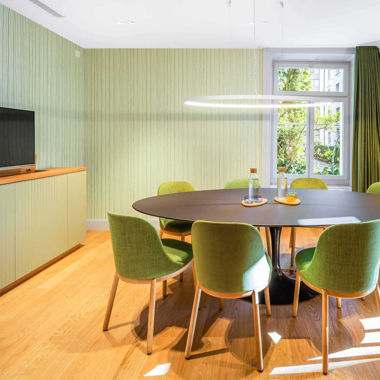 Der Engisaal besticht durch Schlichtheit, Eleganz und seinem Panorama in die Natur. Dank hochwertigen Materialien in Kombination mit modernster Präsentationstechnik eignet sich diese Grüne Oase Zürichs hervorragend für exklusive Strategiemeetings und Sitzungen.